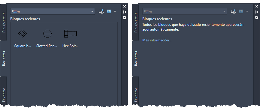 En la ficha Recientes de la paleta de bloques, se muestran instantáneas de los bloques insertados o creados recientemente en el dibujo actual. Puede sincronizar los bloques recientes de un dibujo en una ubicación de almacenamiento en la nube y acceder a ellos desde cualquier dispositivo con la aplicación de escritorio o la