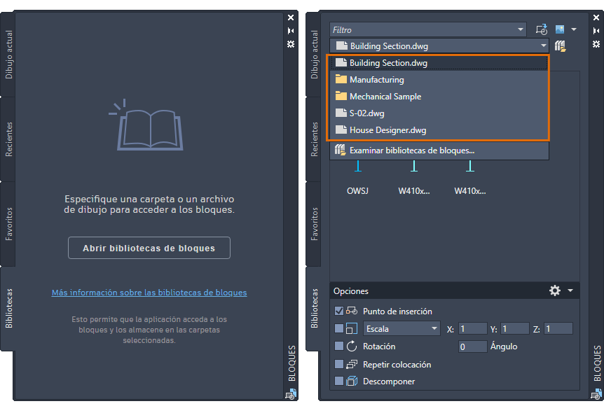 Se ha cambiado el nombre de la ficha Otros dibujos de la paleta de bloques a Bibliotecas. Ahora puede especificar una carpeta, un archivo de dibujo o cualquier definición de bloque almacenada en un dibujo para insertarlos como bloque en el dibujo actual. La ficha Bibliotecas incluye una lista desplegable que muestra las cinco bibliotecas de bloques utilizadas más recientemente (archivo de dibujo o carpeta) para agilizar el acceso. Si elige una biblioteca de bloques en una ubicación de almacenamiento en la nube, puede utilizar los mismos bloques en la aplicación web de AutoCAD.