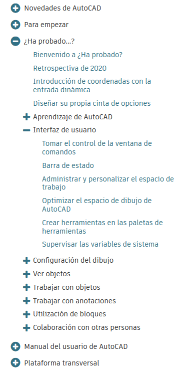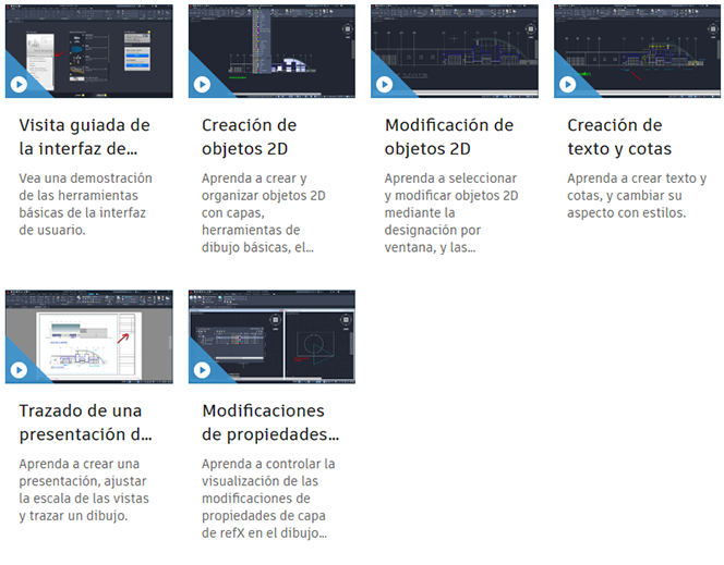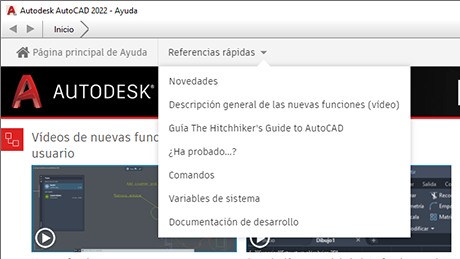 La Ayuda de AutoCAD incluye el nuevo menú Referencias rápidas; los artículos "¿Ha probado?" se organizan ahora en un índice de contenido, y un nuevo formato de tarjeta ofrece un acceso más fácil a los vídeos de aprendizaje.