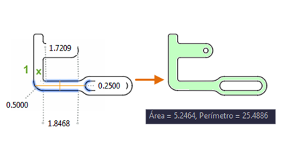 Al hacer clic dentro de un área cerrada, esta se resalta en verde y se muestran los valores calculados en la ventana de comandos y en una información de herramientas dinámica con el formato de unidades actual. Si pulsa Mayús mientras hace clic para seleccionar varias áreas, se calculan el área acumulada y los perímetros. También se incluyen los perímetros de las islas cerradas, como se muestra en la ilustración siguiente.