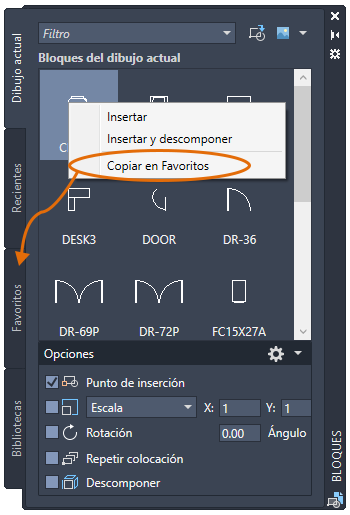 La paleta de bloques ahora permite copiar los bloques que se utilizan con frecuencia en la nueva ficha Favoritos. Puede copiar un bloque desde cualquier ficha de la paleta de bloques a la ficha Favoritos.