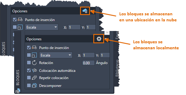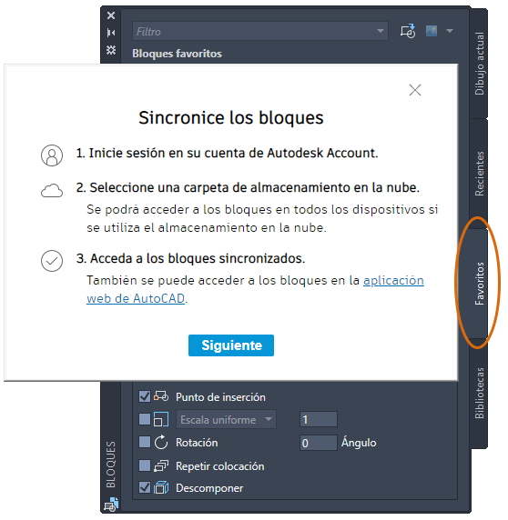 En esta actualización, al utilizar su cuenta de Autodesk Account y sincronizar los bloques con un proveedor de almacenamiento en la nube, los bloques recientes y