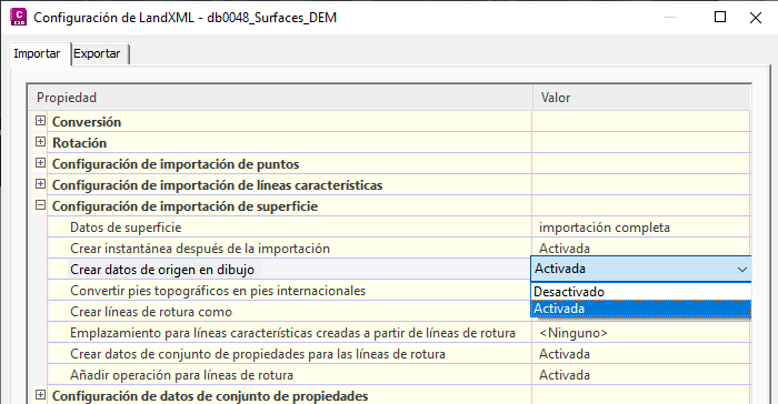 Antes de importar datos LandXML para generar una superficie, compruebe los parámetros de LandXML para la importación de superficies, como se muestra en la figura 2.