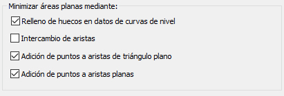 Cuando se añaden curvas de nivel a una definición de superficie, el cuadro de diálogo Añadir datos de curvas de nivel incluye parámetros por defecto para reducir las áreas planas, tal como se muestra en la figura 6.