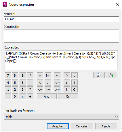 Esta expresión asume un valor "n" de Manning de 0,013, el estándar para una tubería de hormigón. De hecho, las tuberías incluyen un componente guardado para el valor "n" de Manning que se puede definir. Sin embargo, al añadir este componente a la expresión, se generaría un resultado no deseado, por lo que no se debe utilizar en este procedimiento.