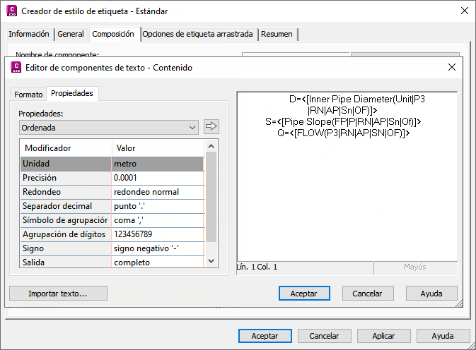 El siguiente paso consiste en crear un estilo de etiqueta de tubería para la planta y el perfil que muestre este valor de caudal. En la figura 12 se muestra un ejemplo de este estilo de etiqueta, con los parámetros hidráulicos correspondientes: