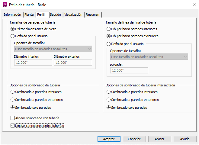 Utilice la opción Limpiar conexiones entre tuberías del cuadro de diálogo Estilo de tubería, tal como se muestra en la figura 4, para mejorar el aspecto de los perfiles de tubería que forma que las tuberías parezcan gráficamente alineadas como se espera. Esta opción no está activada por defecto, por lo que debe seleccionarla.