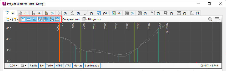 El valor de deformación vertical y los parámetros de visualización/ocultación de cada componente visual de una vista de perfil o en sección determinada también se pueden controlar desde los controles de vista asociados en la ventana principal de Project Explorer, como se indica a continuación.