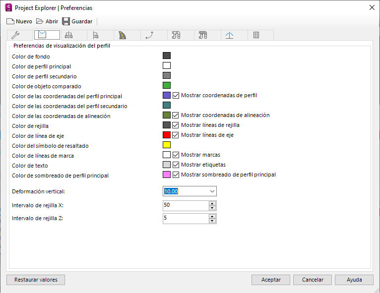 Las cinco fichas restantes de la ventana Preferencias de Project Explorer controlan los parámetros de color, estilo, rejilla y escala de las distintas vistas de perfil y en sección de la ventana principal de Project Explorer.