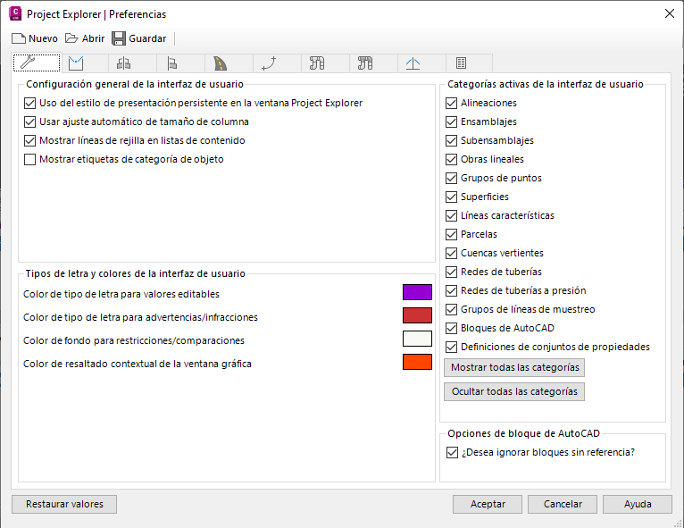 Las Preferencias determinan cualquier aspecto de la interfaz de usuario de Project Explorer que no sea relevante para la generación de informes. Por ejemplo, los esquemas de color y los parámetros de escala por defecto para las vistas de perfil y en sección, la configuración de fuente para la interfaz de usuario, la visibilidad y el diseño de panel para cada ficha Categoría de objeto individual en la ventana Project Explorer.
