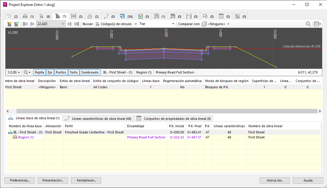 Si lo desea, bloquee el Intervalo de P.K. de alineación/perfil (cadenada) para que quede un valor común para todos los tipos de entidad.
