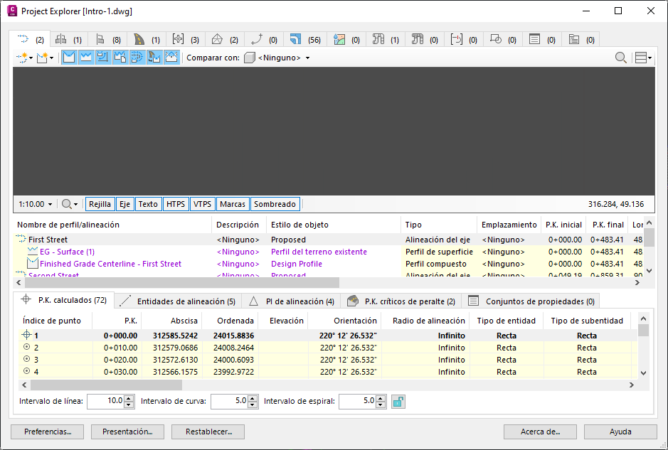 Modifique el Intervalo de P.K. de alineación/perfil (cadenada) para entidades de línea, entidades de curva y entidades de espiral.