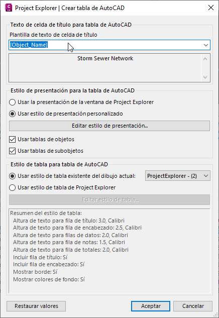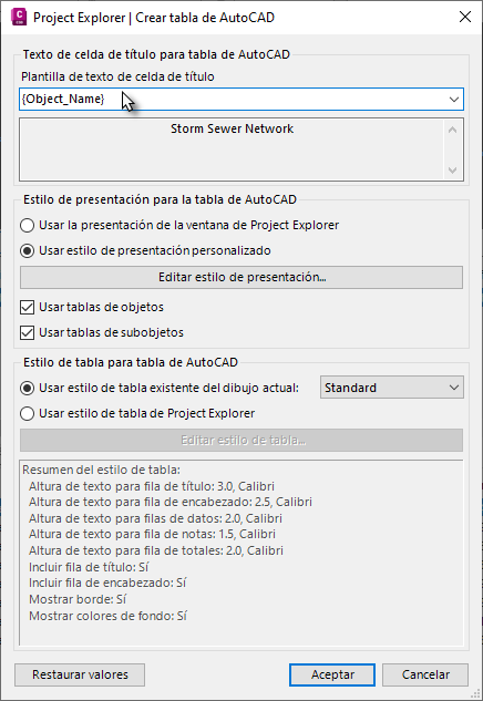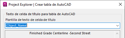 Tenga en cuenta que la fila de título de la tabla de AutoCAD se puede derivar de una serie de variables dinámicas durante el proceso de creación. O bien, se puede especificar un nombre de archivo fijo en este cuadro de diálogo. Por defecto, la fila de título mostrará el nombre del objeto seleccionado.