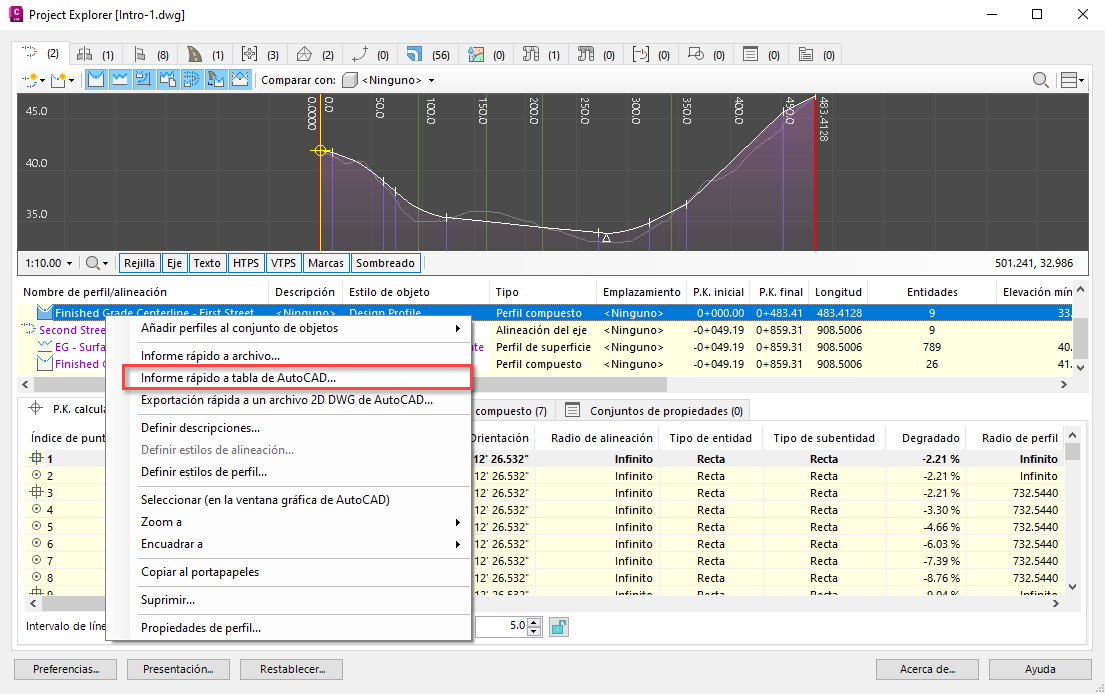 En este aprendizaje se muestra el uso de Project Explorer para insertar dos tablas estáticas de AutoCAD en un dibujo de Civil 3D. La primera tabla contendrá un informe sencillo de alineación/perfil de Civil 3D. La segunda tabla contendrá un informe de conductos de tubería derivado de una red de tuberías de Civil 3D .