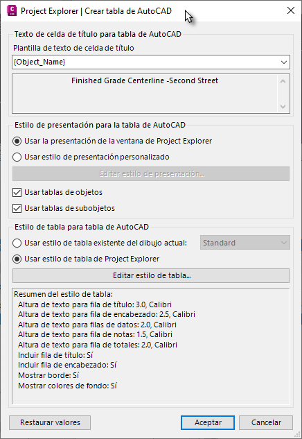 Para volver a utilizar el estilo de tabla de AutoCAD creado para la tabla de alineación, asegúrese de que esté seleccionada la opción Usar estilo de tabla existente del dibujo actual y seleccione Project Explorer - (1) en la lista de estilos de tabla existentes.
