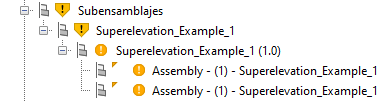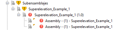 - Cuando es necesario actualizar una ruta para un archivo PKT de subensamblaje, los símbolos y la información de herramientas se muestran en los elementos del árbol del prospector para advertirle.