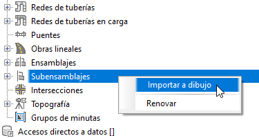 - Se ha añadido la capacidad de importar un archivo PKT creado en Subassembly Composer directamente en el dibujo sin utilizar una paleta de herramientas. Haga clic con el botón derecho en el nodo Subensamblajes del árbol del prospector y seleccione Importar a dibujo.