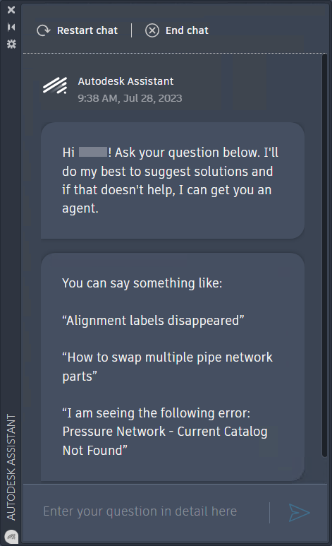 Autodesk Assistant ofrece autoservicio guiado por inteligencia artificial y opciones para ponerse en contacto con el servicio de soporte desde el producto. Busque soluciones a las preguntas sobre productos, solicite una devolución de llamada si es necesario o cree un caso de soporte.
