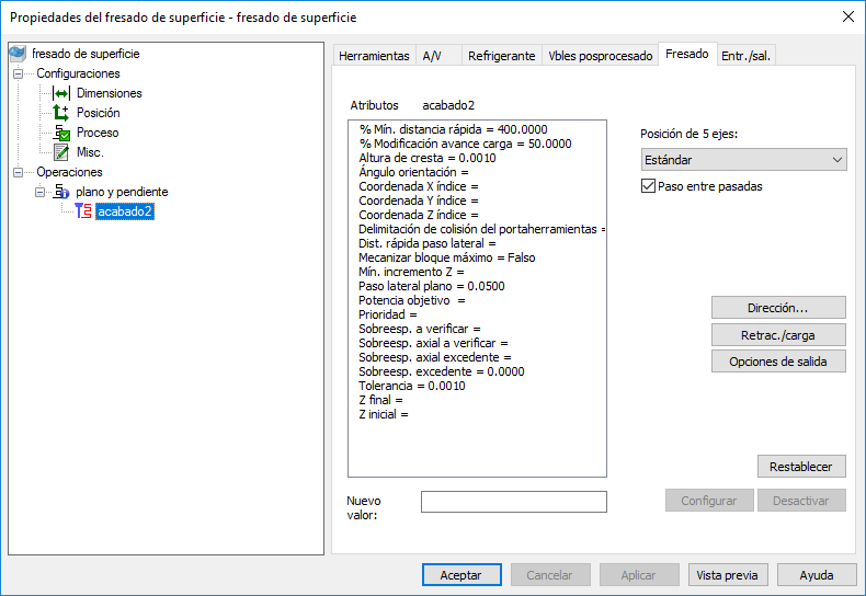 Paso lateral pendiente — Introduzca la distancia entre pasadas de mecanizado sucesivas. Es para las partes pendientes de la trayectoria de herramienta.