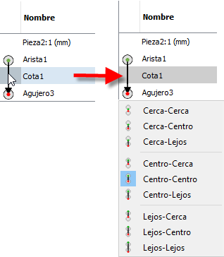 Si tanto la operación por encima como por debajo de la cota es una operación de tamaño, existen varias opciones. La primera indica si el origen de la cota debería asociarse a Cerca, Centro o Lejos de la operación inmediatamente sobre la cota. El segundo elemento es para el enlace a la operación justo debajo de la cota. Si solo una de las operaciones es una operación de tamaño, solo hay tres opciones en la lista.