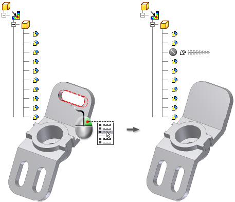 Para simplificar un modelo de pieza, elimine las piezas u operaciones de poco impacto que pueden complican la creación de mallas. Elimine las piezas que no desempeñan funciones importantes en los resultados de la simulación y las piezas con operaciones pequeñas como las siguientes: