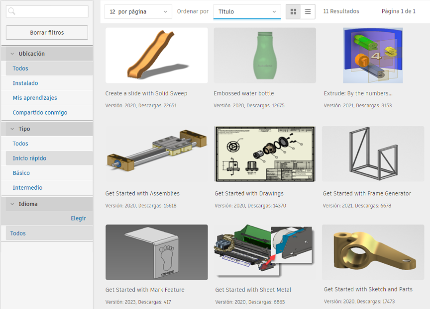 Ajuste el filtro Tipo en Inicio rápido para ver los aprendizajes que le presentarán los aspectos básicos de creación de bocetos, modelado de piezas y documentación del diseño en un dibujo.