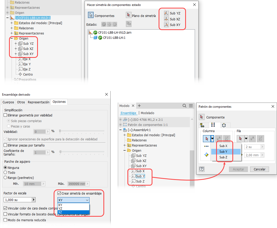 Ahora, los nombres personalizados asignados a las operaciones de trabajo de origen se reconocen y rellenan en los distintos cuadros de diálogo utilizados para comandos como Componentes de simetría, Patrón de componentes y Ensamblaje derivado.