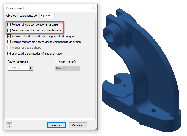 Además, al crear piezas o ensamblajes derivados, puede decidir desactivar o romper el vínculo entre el componente base y la pieza o el ensamblaje derivados mediante las nuevas casillas de verificación.