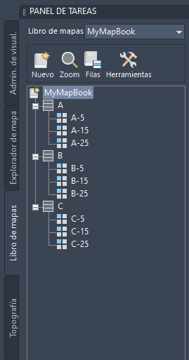 - Para guardar la configuración de libro de mapas para su uso en el futuro, haga clic con el botón derecho en el nombre de libro de mapas en la ficha Libro de mapas del Panel de tareas. Haga clic en Guardar configuración. Especifique un nombre y una ubicación para el archivo de configuración.