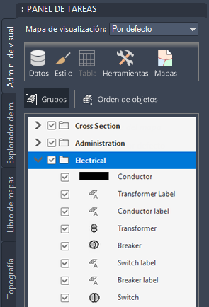 Organice objetos en el dibujo en función de los elementos reales que representan (por ejemplo, carreteras, parcelas, cables o tuberías de agua).