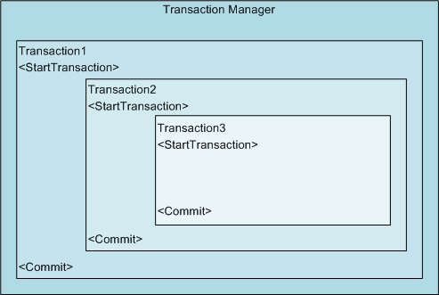 As you start new transactions, they are added into the previous transaction. Nested transactions must be committed or aborted in the opposite order in which they are created. So if you have three transactions, you must close the third or innermost one before the second and finally the first. If you abort the first transaction, the changes made by all three transactions are undone.
