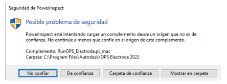 PowerInspect comprueba si existen problemas de seguridad potenciales cuando una acción se rige por la interfaz de automatización de PowerInspect, por ejemplo, al cargar complementos. Si hay problemas de seguridad, como una fuente que no es de confianza, PowerInspect solicita permiso para continuar: