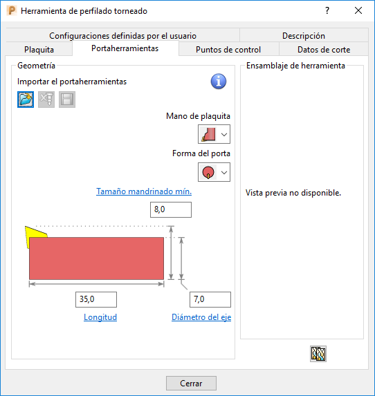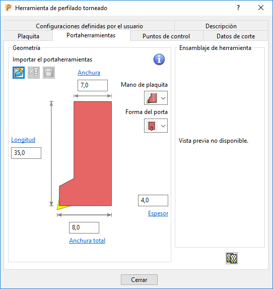 La pestaña de Portaherramientas del cuadro de diálogo de Herramienta define la parte del portaherramientas de la herramienta. Las trayectorias evitan el contacto con el portaherramientas.