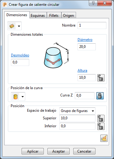 Desmoldeo — Introduzca el ángulo de desmoldeo de la figura. Es un ángulo incluido en la pared de un molde, de forma que la apertura de la cavidad es más ancha que la base, para poder expulsar la pieza con mayor facilidad.