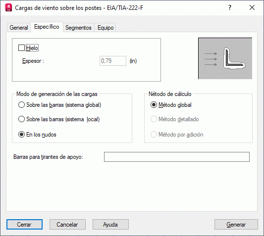 Nota: Este es el espesor de la capa. En los cálculos, una dimensión del elemento transversal al viento aumenta el doble del valor del espesor de hielo especificado.