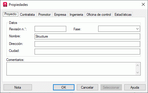 Seleccione Archivo Propiedades para proporcionar información sobre la estructura dimensionada.