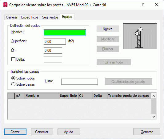 Al abrir el cuadro de diálogo Cargas de viento sobre los postes y hacer clic en la ficha Equipo, se muestra el siguiente cuadro de diálogo.