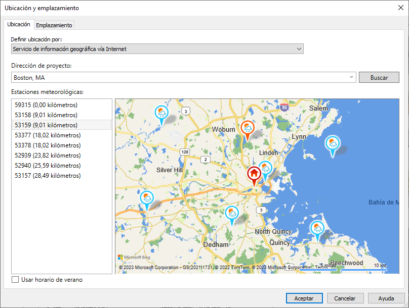 Antes de efectuar optimización de energía del modelo de construcción, especifique su ubicación geográfica y seleccione una estación meteorológica cercana.