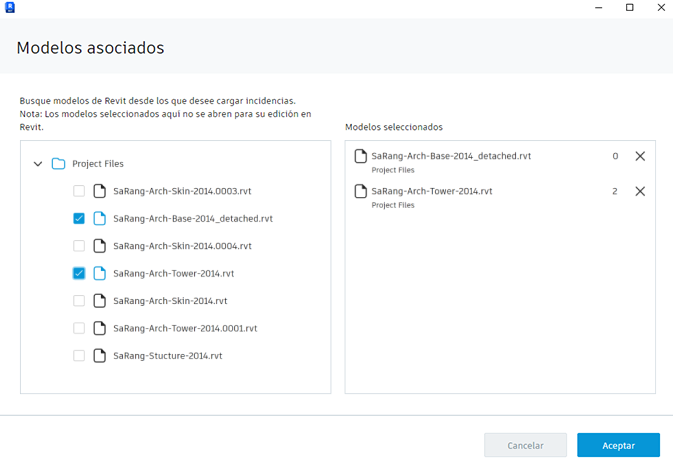 - Expanda la estructura de carpetas para buscar los archivos de Revit (.rvt) que desea asociar al archivo abierto.