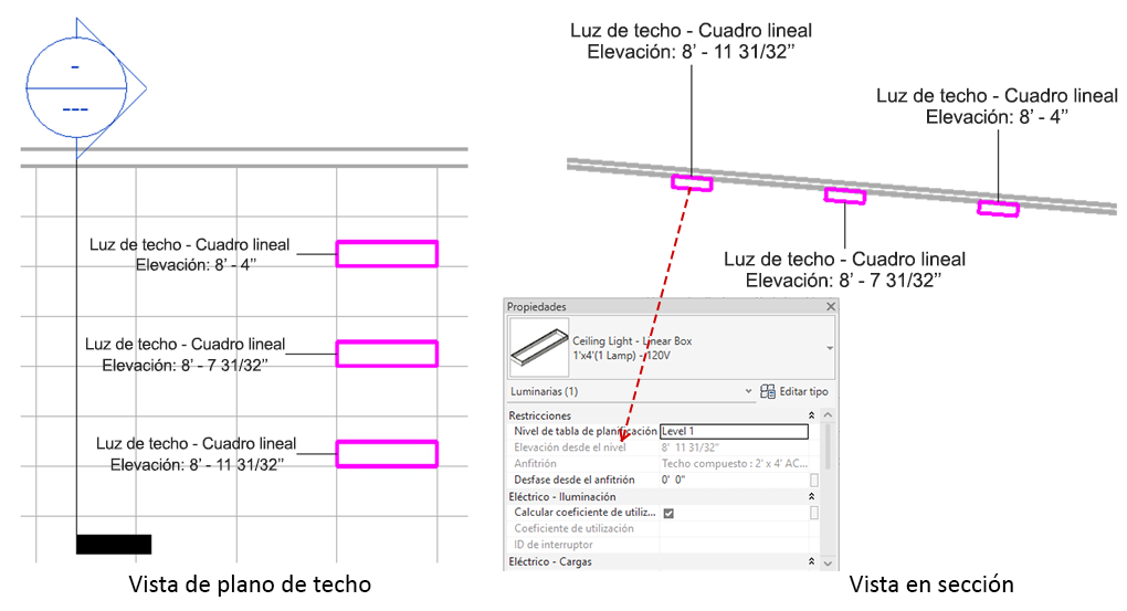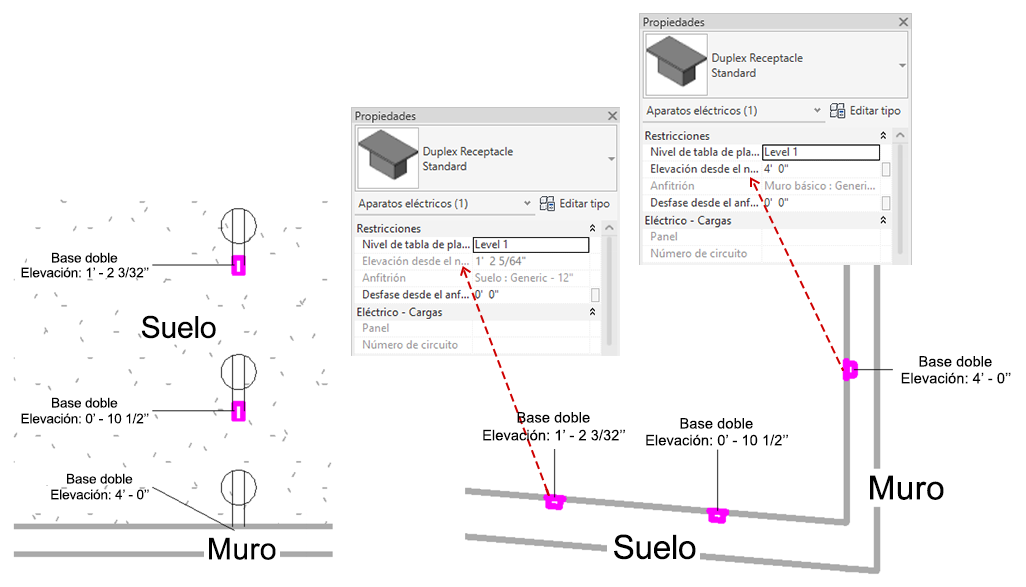 El parámetro Elevación desde el nivel no se puede editar cuando el elemento se coloca en una superficie no vertical, como cuando se coloca una toma de corriente en el suelo o se coloca una luminaria en el techo.