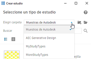 Cuando se selecciona una carpeta de la lista, en el cuadro de diálogo Crear estudio, se muestran los tipos de estudio disponibles.