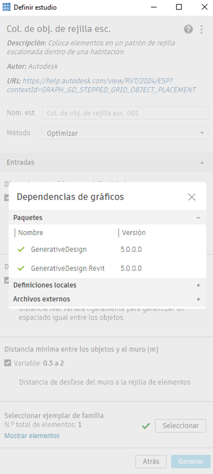 Para que pueda funcionar en la herramienta Diseño generativo de Revit, es posible que el gráfico de Dynamo que impulsa un tipo de estudio requiera determinadas dependencias como, por ejemplo, paquetes, nodos personalizados o archivos externos. El cuadro de diálogo Dependencias de gráficos permite ver rápidamente los paquetes y otras dependencias que necesita el gráfico para ejecutarse correctamente, e identificar las dependencias que faltan e instalarlas en Dynamo.