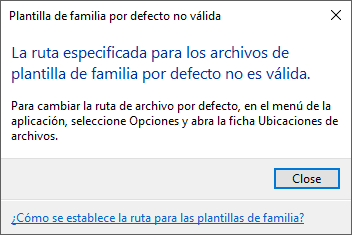 Aviso: Si se eliminan los paquetes de contenido esenciales, Revit puede mostrar el siguiente mensaje porque no se han encontrado plantillas de familia en la ruta de plantilla de familia especificada en el archivo Revit.ini.