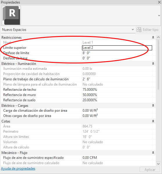 Observe que aparecen dos controles de arrastre (superior e inferior) y sus correspondientes cotas receptivas. Los controles de arrastre, las cotas y el espacio sombreado indican la extensión vertical del espacio seleccionado. El control de arrastre superior y las cotas indican el desfase de límite. El control de arrastre inferior y las cotas indican el desfase de base.