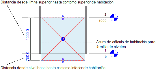 Revit muestra cotas receptivas para indicar la distancia de los contornos superior e inferior desde el límite superior y el nivel base de la habitación. Si lo desea puede introducir un valor directamente. Consulte Utilizar cotas receptivas.