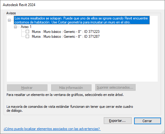 Expanda los elementos para ver los elementos individuales asociados a cada aviso. Al seleccionar el texto que se encuentra cerca del aviso, el elemento se resalta en todas las vistas abiertas en las que se muestre.