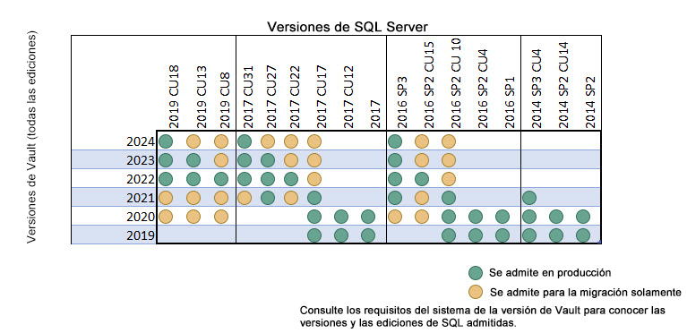 En la siguiente tabla se resumen las versiones compatibles de Vault y SQL con puntos de color verde. Los puntos de color amarillo son la ruta de actualización recomendada. Consulte Requisitos del sistema de Vault para su versión de Vault a fin de garantizar la compatibilidad entre versiones del producto Vault y SQL.