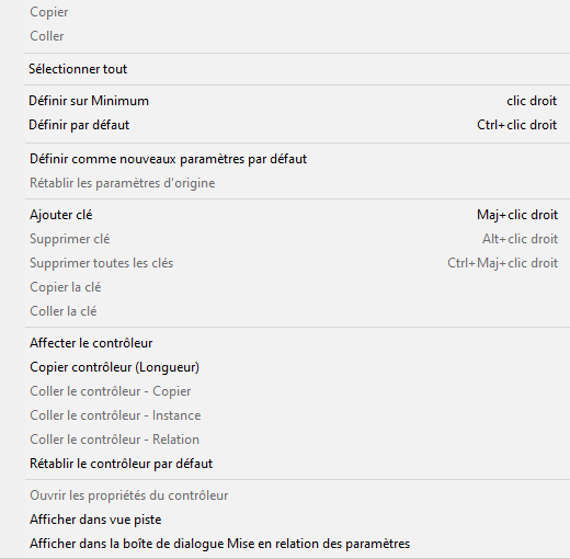 Pour ouvrir le menu contextuel de la glissière, cliquez avec le bouton droit de la souris sur la zone de saisie d'un paramètre pouvant être animé. Ce menu contient des options permettant de couper, de copier et de coller des valeurs, des liens et des pistes d’animation entre divers paramètres. Il permet également de visualiser le paramètre dans la Vue piste ou dans la boîte de dialogue Mise en relation des paramètres.