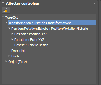 Lorsque vous affectez un contrôleur à partir du menu Animation, un contrôleur de liste est automatiquement attribué comme contrôleur par défaut, le contrôleur sélectionné étant placé en première position dans la liste. Ce comportement est différent lorsque vous affectez un contrôleur dans le groupe de fonctions Mouvement ou dans la vue piste (où seul le contrôleur spécifié est affecté).