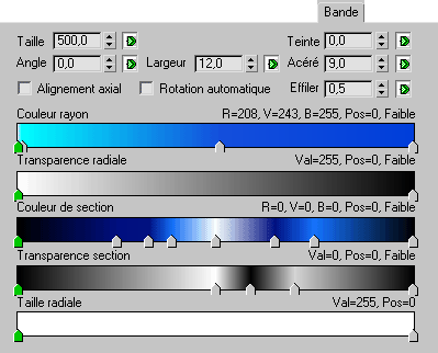 Les dégradés associés à l'effet de bande sont identiques aux autres dégradés, à l'exception de Couleur de section et Transparence section. Ces options sont utiles lorsque vous voulez créer des branches de bande ayant une apparence " adoucie ". Les deux dégradés vont du centre vers l'extrémité extérieure de chaque branche.